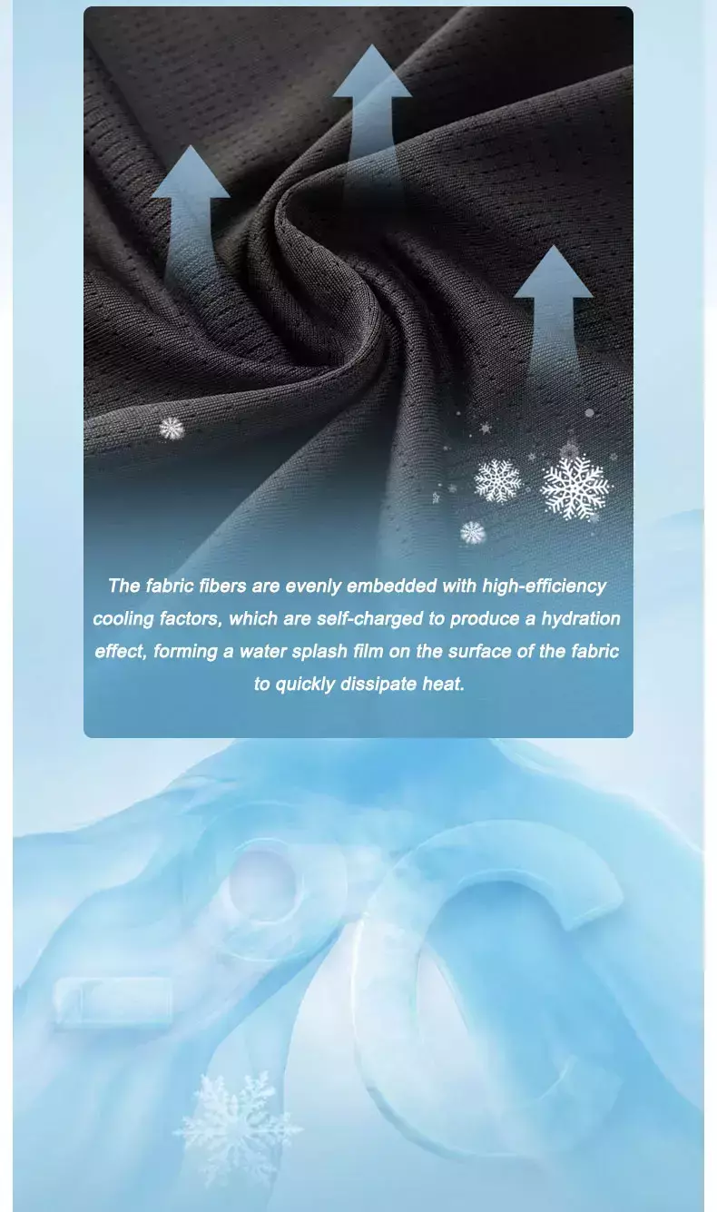 As fibras do tecido são incorporadas uniformemente com fatores de resfriamento de alta eficiência, que são auto-carregados para produzir um efeito de hidratação, formando uma película de respingos de água na superfície do tecido para dissipar rapidamente o calor.