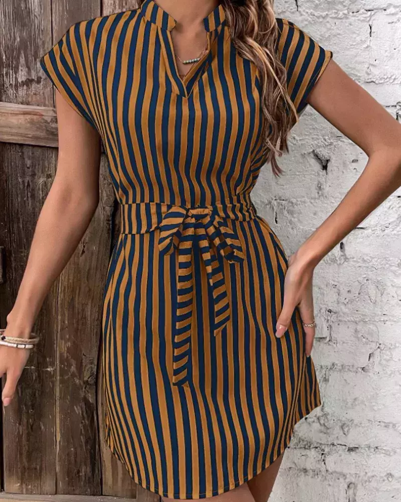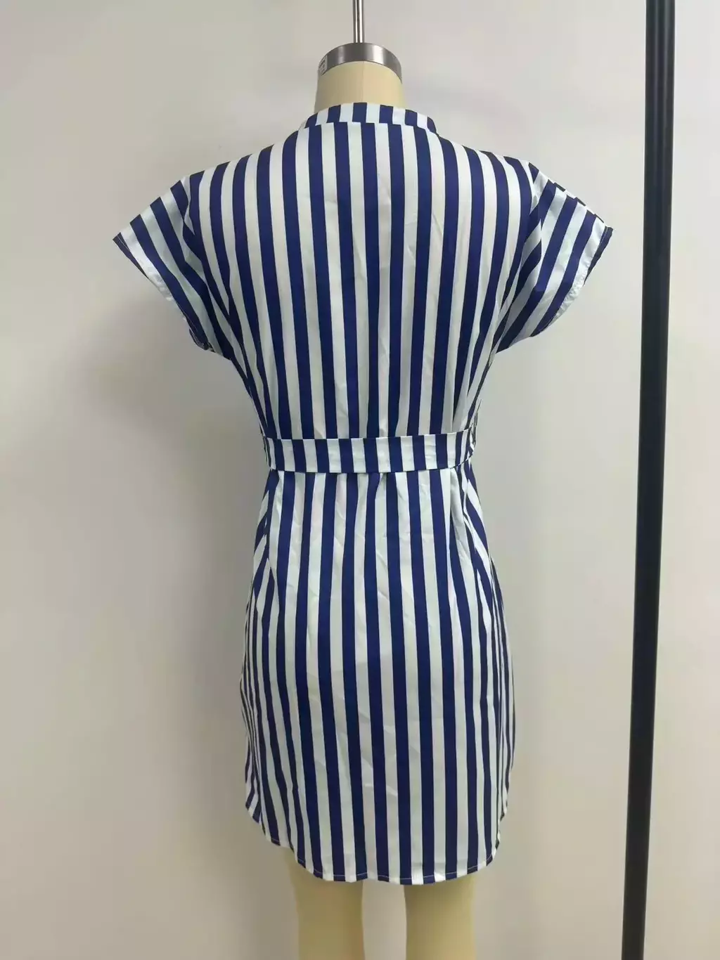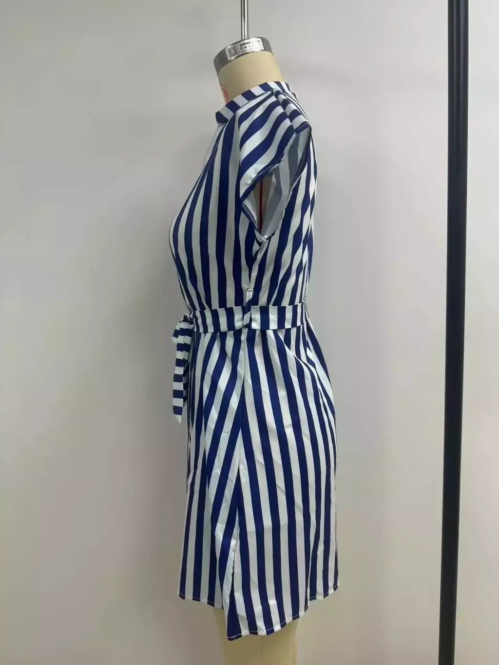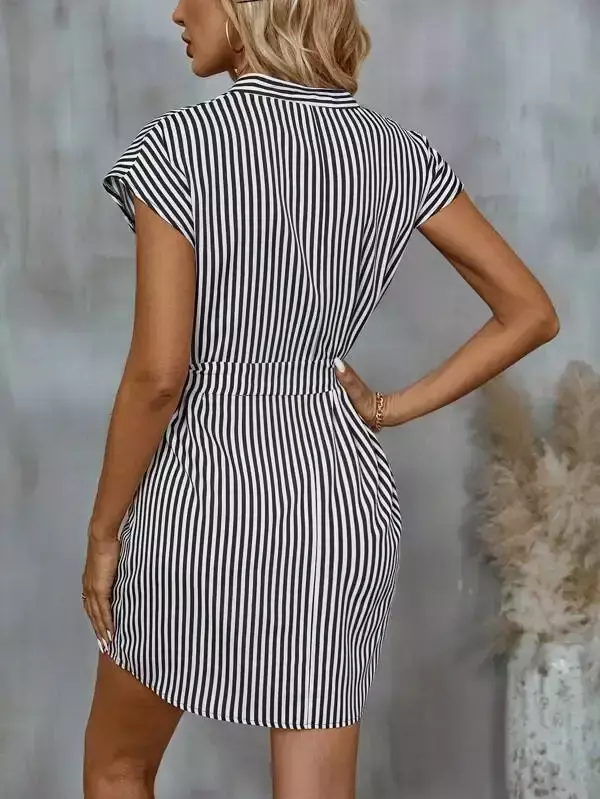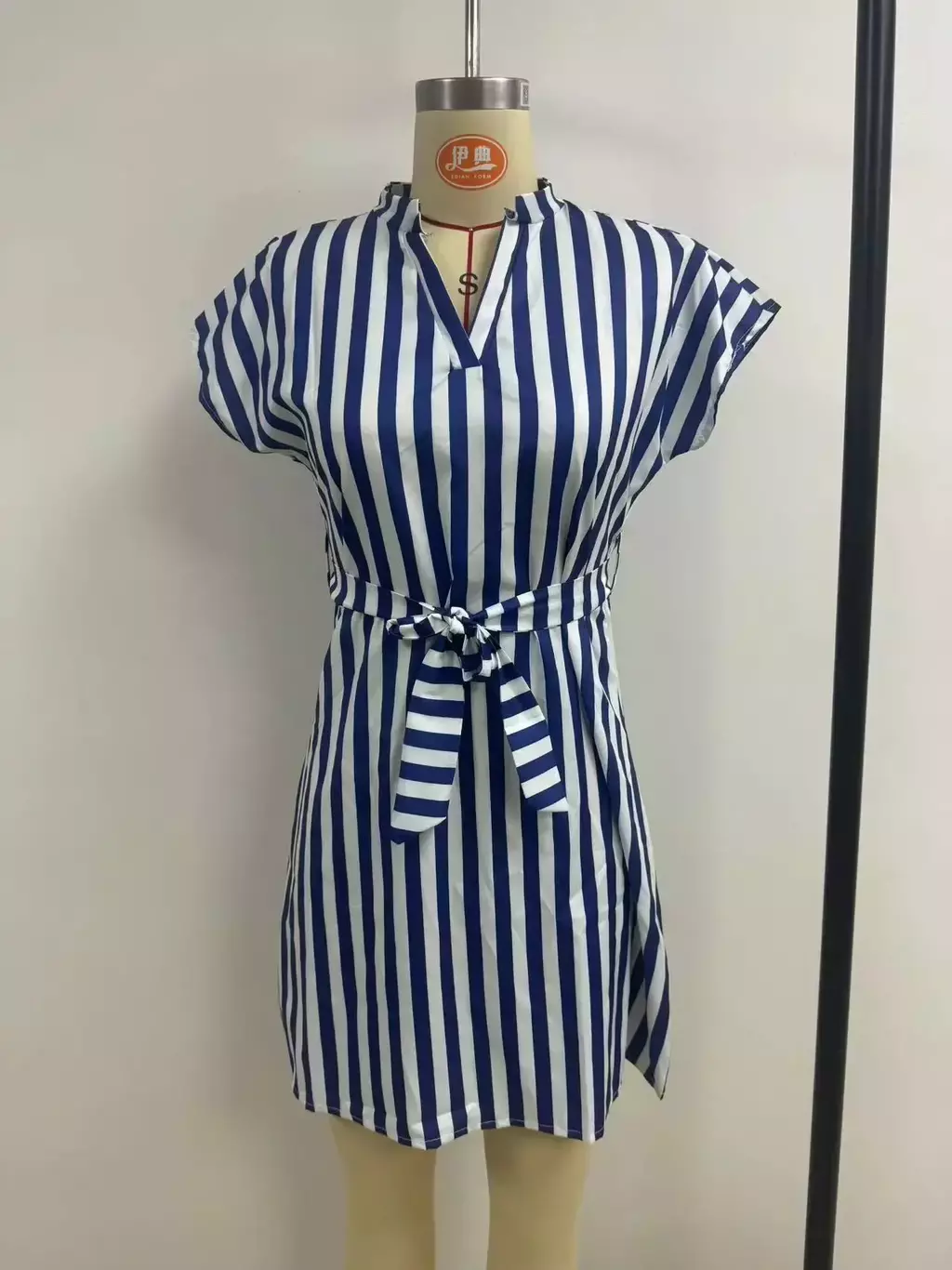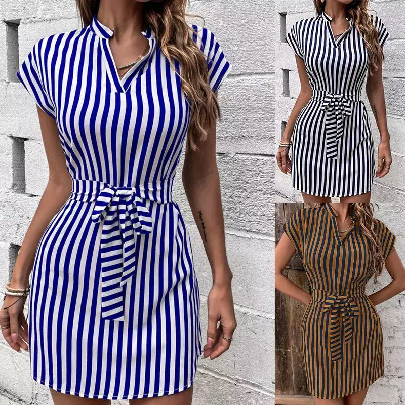 Com estampa listrada moderna, decote em V delicado e modelagem sem mangas, ele valoriza sua silhueta com leveza e sofisticação. A amarração em renda ajustável traz aquele toque feminino que faz toda a diferença, enquanto a saia curta garante frescor e movimento para os dias quentes.