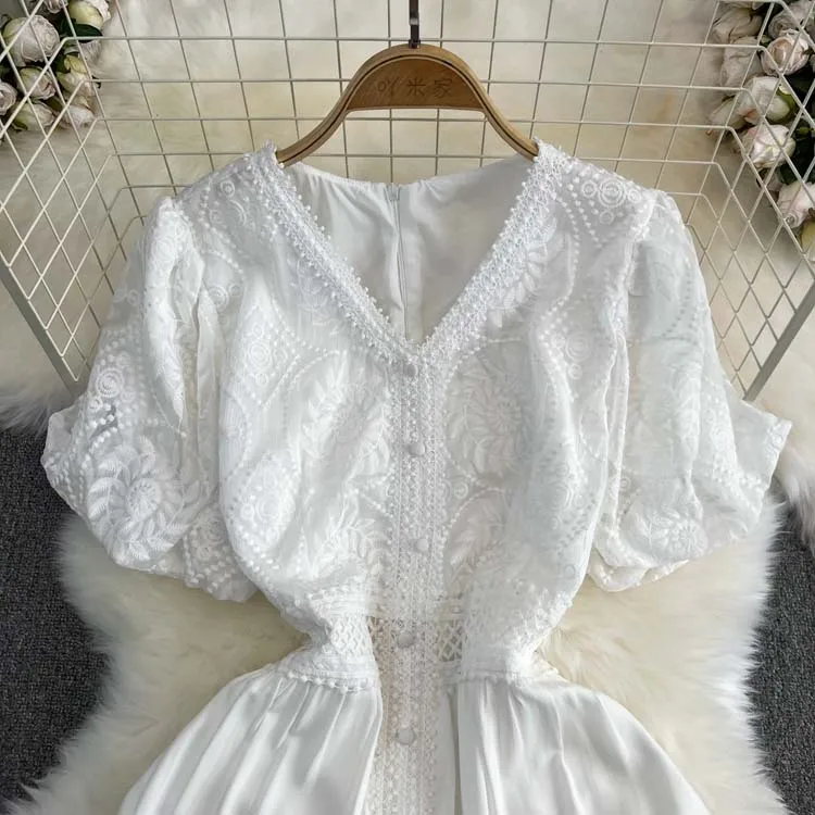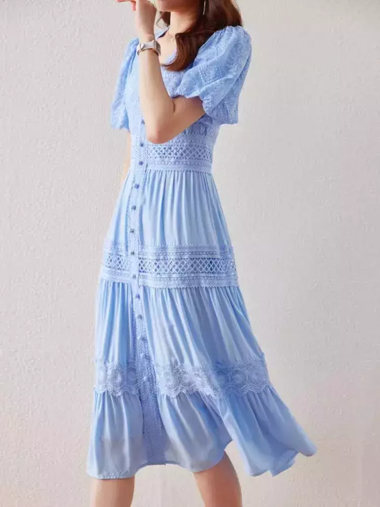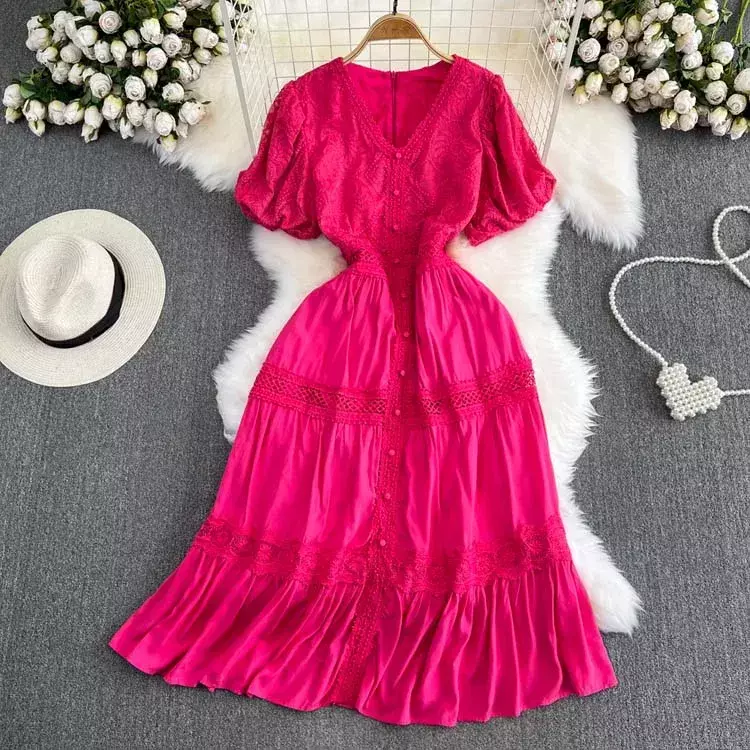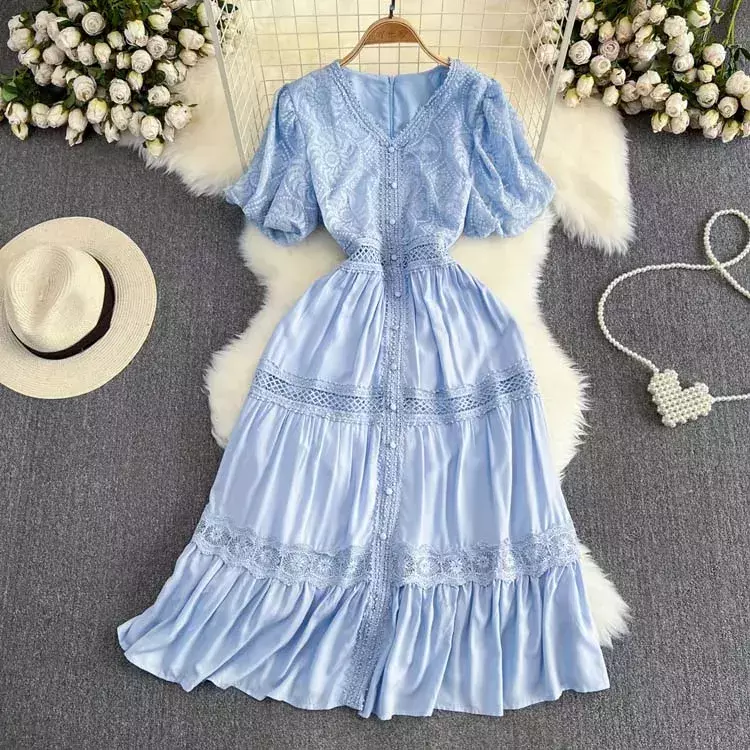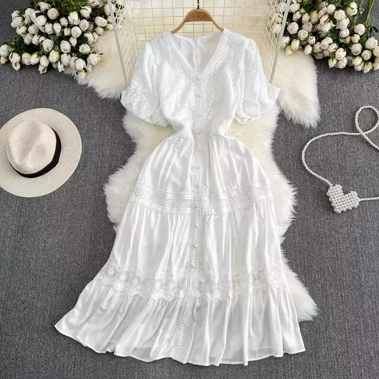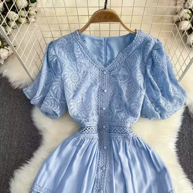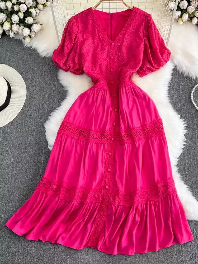 Descubra o charme do vestido de manga curta puff, com decote em V sofisticado, detalhes de renda bordada e acabamento em retalhos delicados. Um look leve, elegante e moderno, perfeito para ocasiões especiais ou para um dia de verão cheio de estilo. 🌸