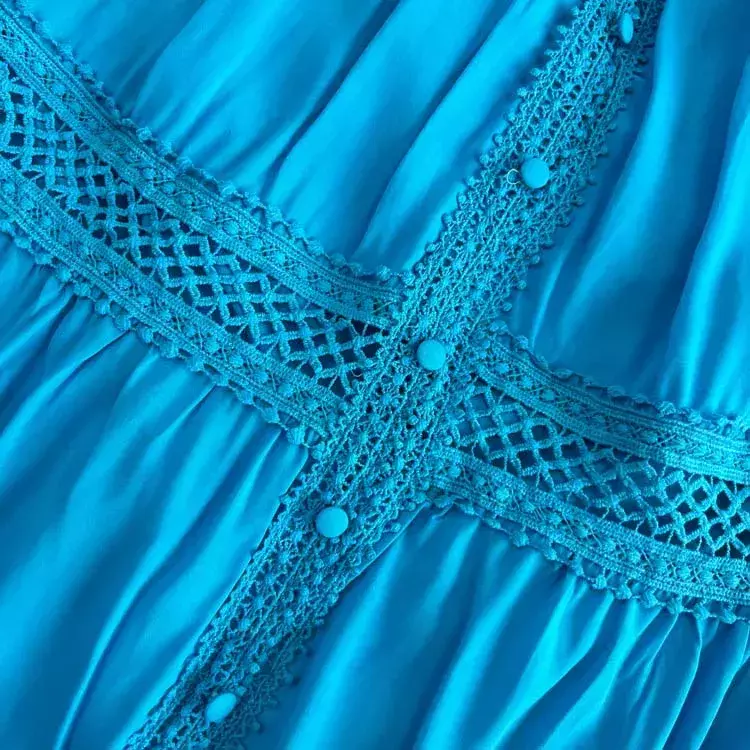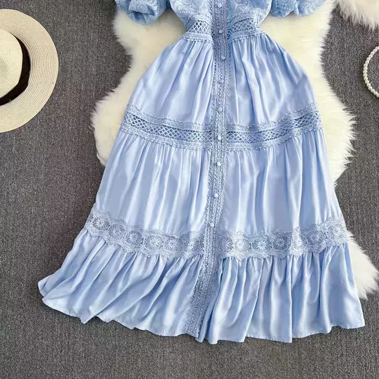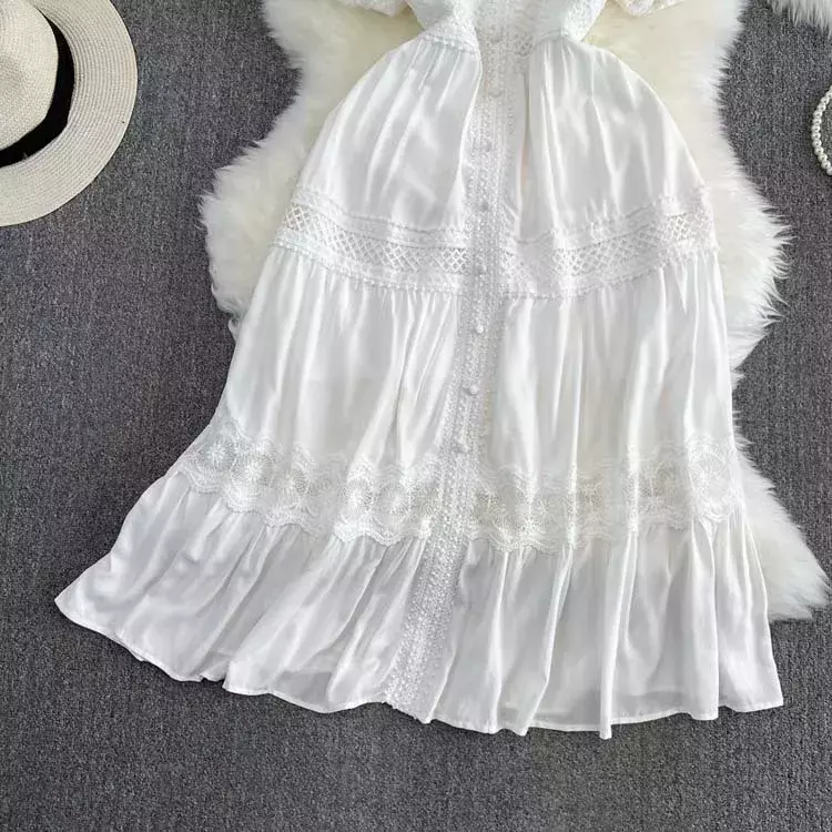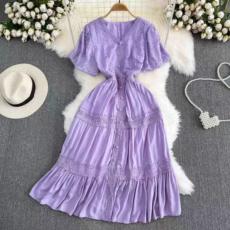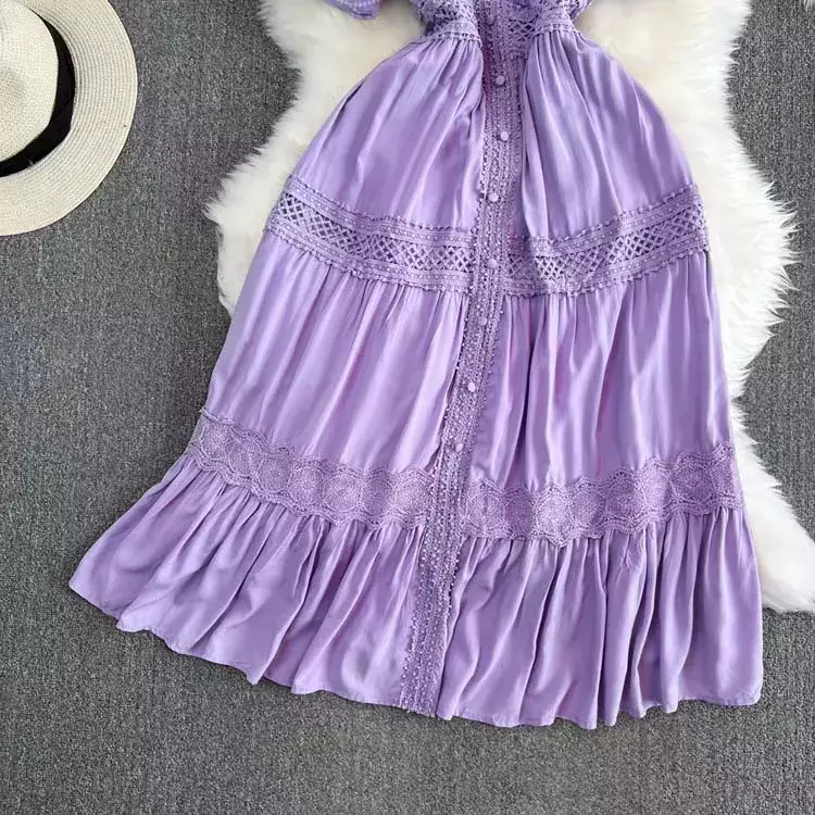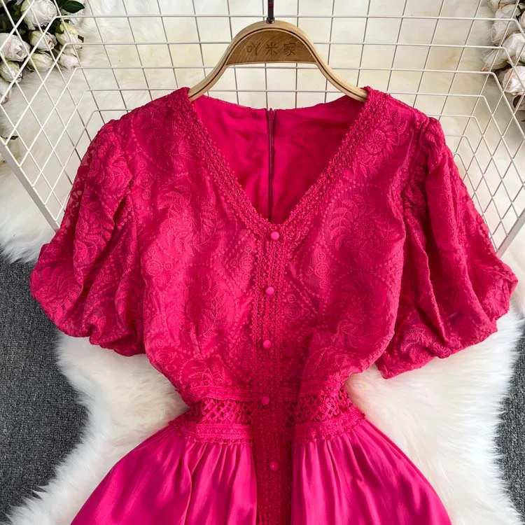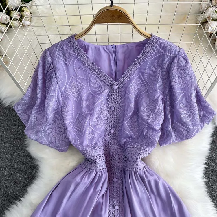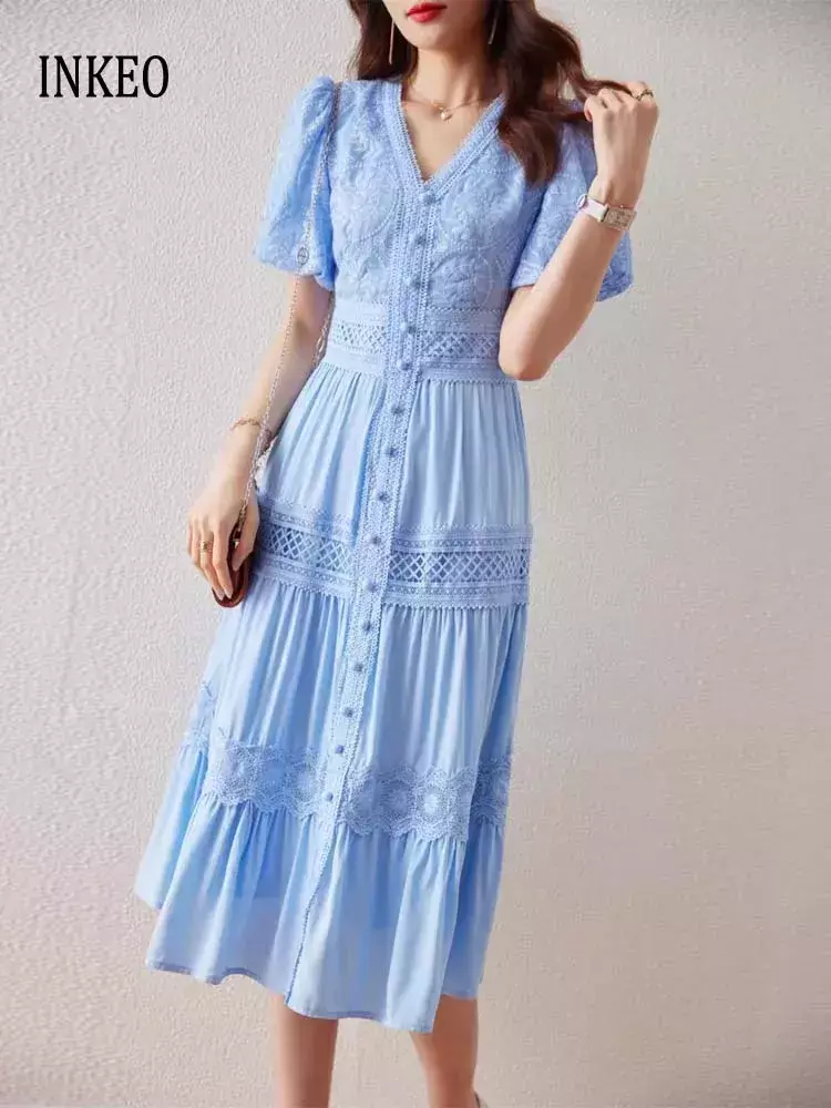 Descubra o charme do vestido de manga curta puff, com decote em V sofisticado, detalhes de renda bordada e acabamento em retalhos delicados. Um look leve, elegante e moderno, perfeito para ocasiões especiais ou para um dia de verão cheio de estilo. 🌸