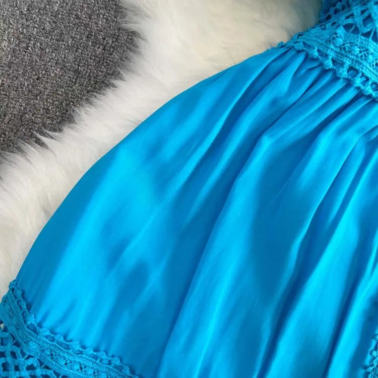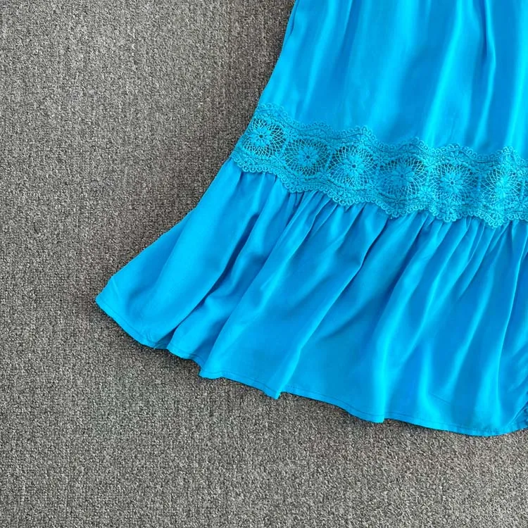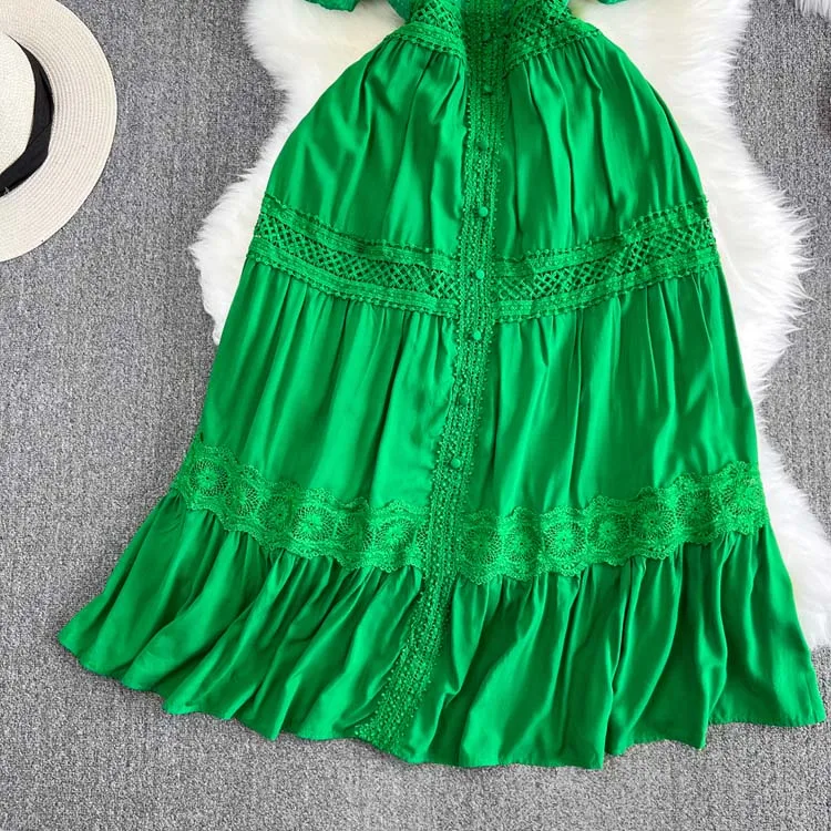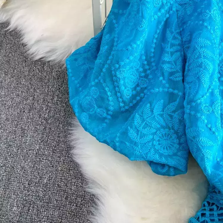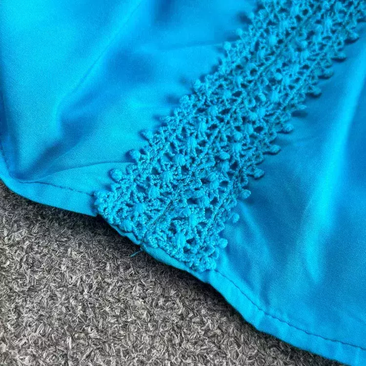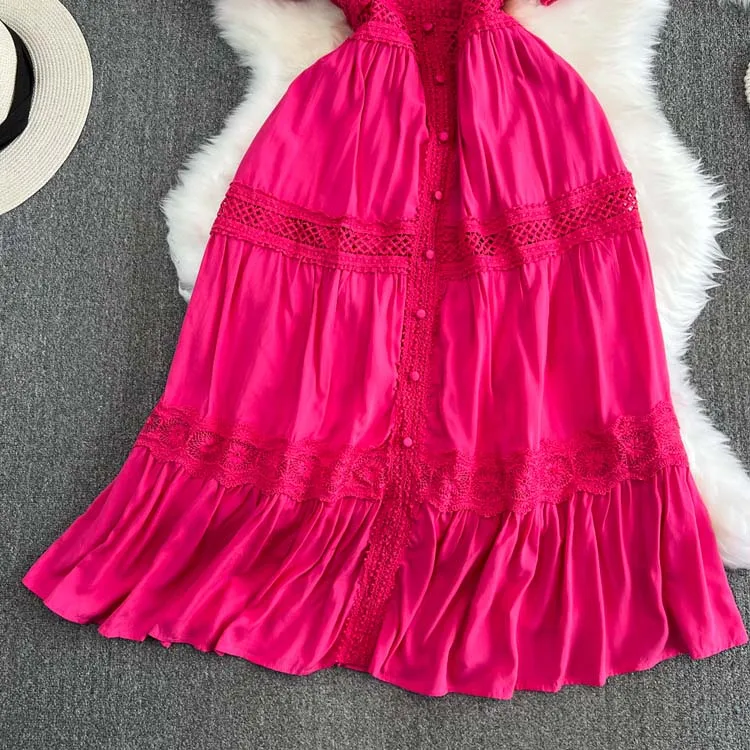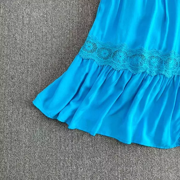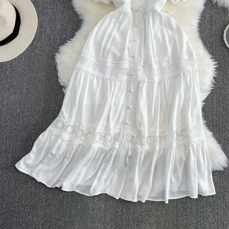 Descubra o charme do vestido de manga curta puff, com decote em V sofisticado, detalhes de renda bordada e acabamento em retalhos delicados. Um look leve, elegante e moderno, perfeito para ocasiões especiais ou para um dia de verão cheio de estilo. 🌸